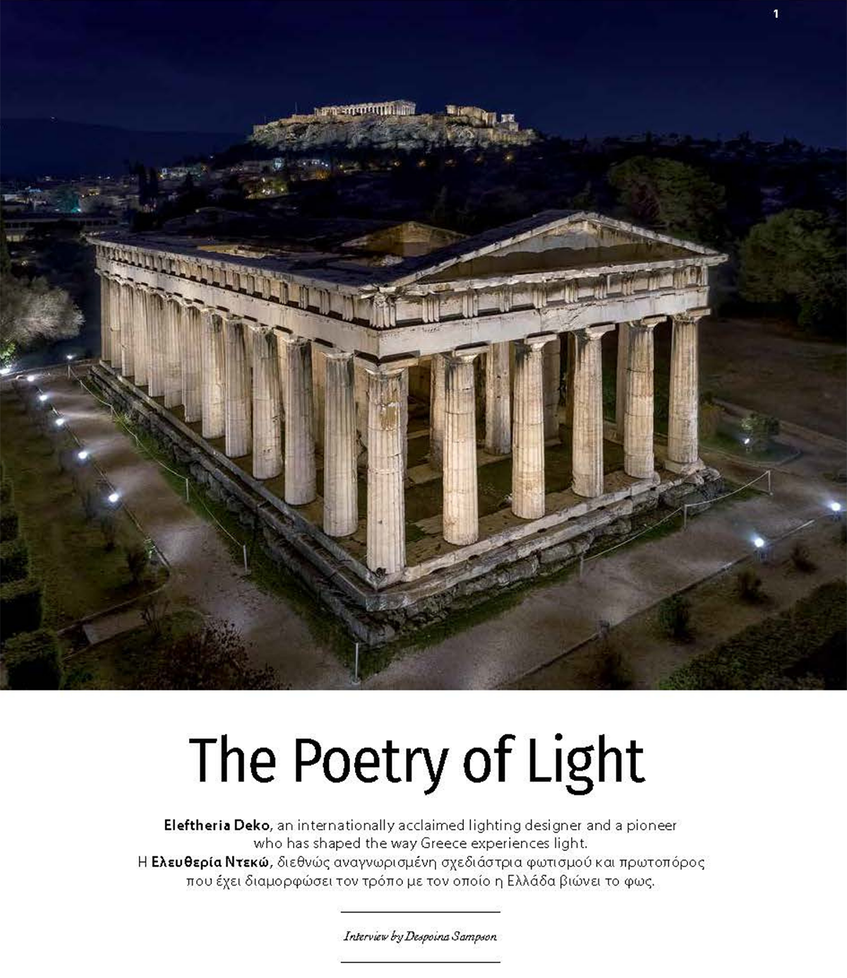 Edeko Lighting Studio was founded in 2000 by lighting design pioneer, Eleftheria Deko. The studio’s team of lighting experts approaches every space with sensitivity and artistic ingenuity, illuminating the creative vision of architects, designers, stage directors, and artists. Dedicated to the art of visual silence, the studio delivers original lighting schemes for contemporary and historic buildings, stage performances, events, and installations.