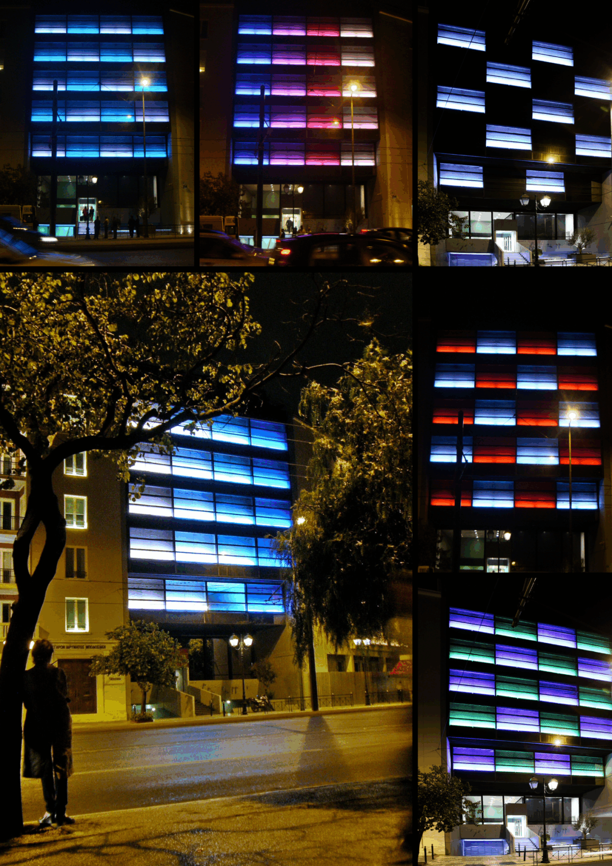 At number 14 Amalias Avenue, the Onassis Foundation commissioned the lighting of a central building, giving it an artistic identity that transformed the atmosphere of the avenue at night. Each window was turned into a “pixel” illuminated from within, either in sync or independently, creating a vibrant play of colors that transformed the dull nighttime image of the city.