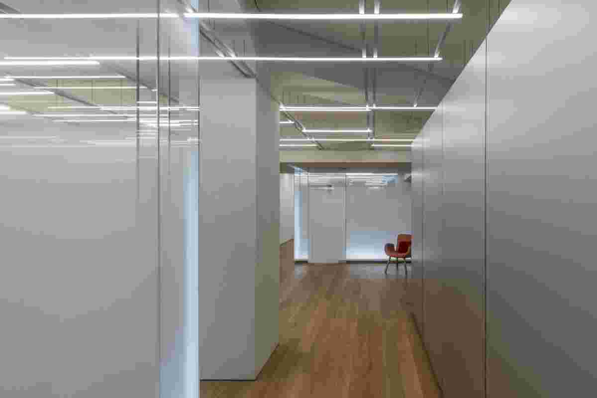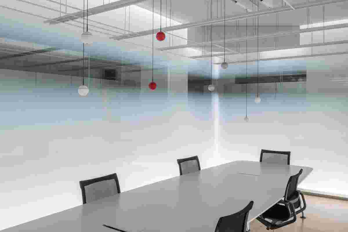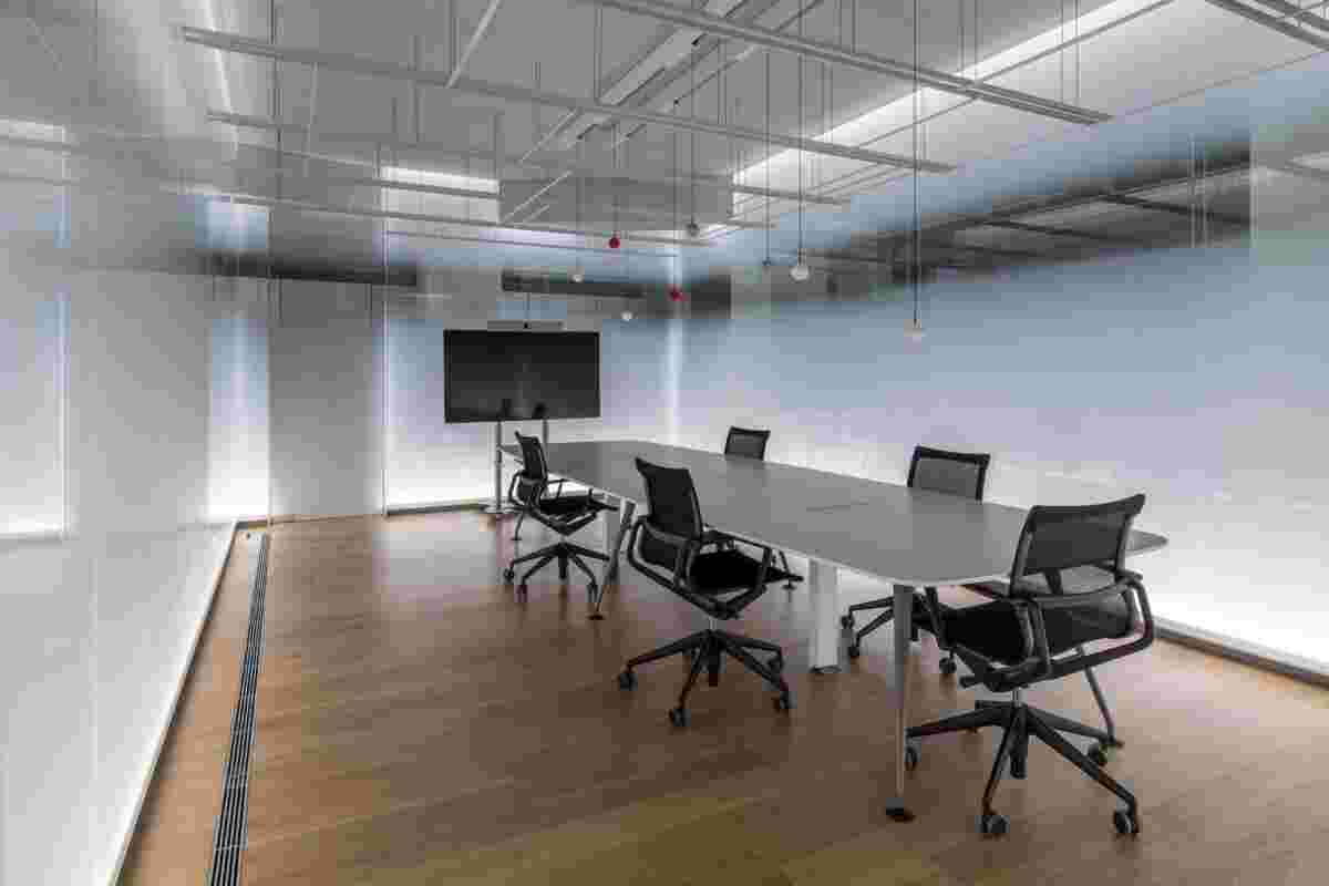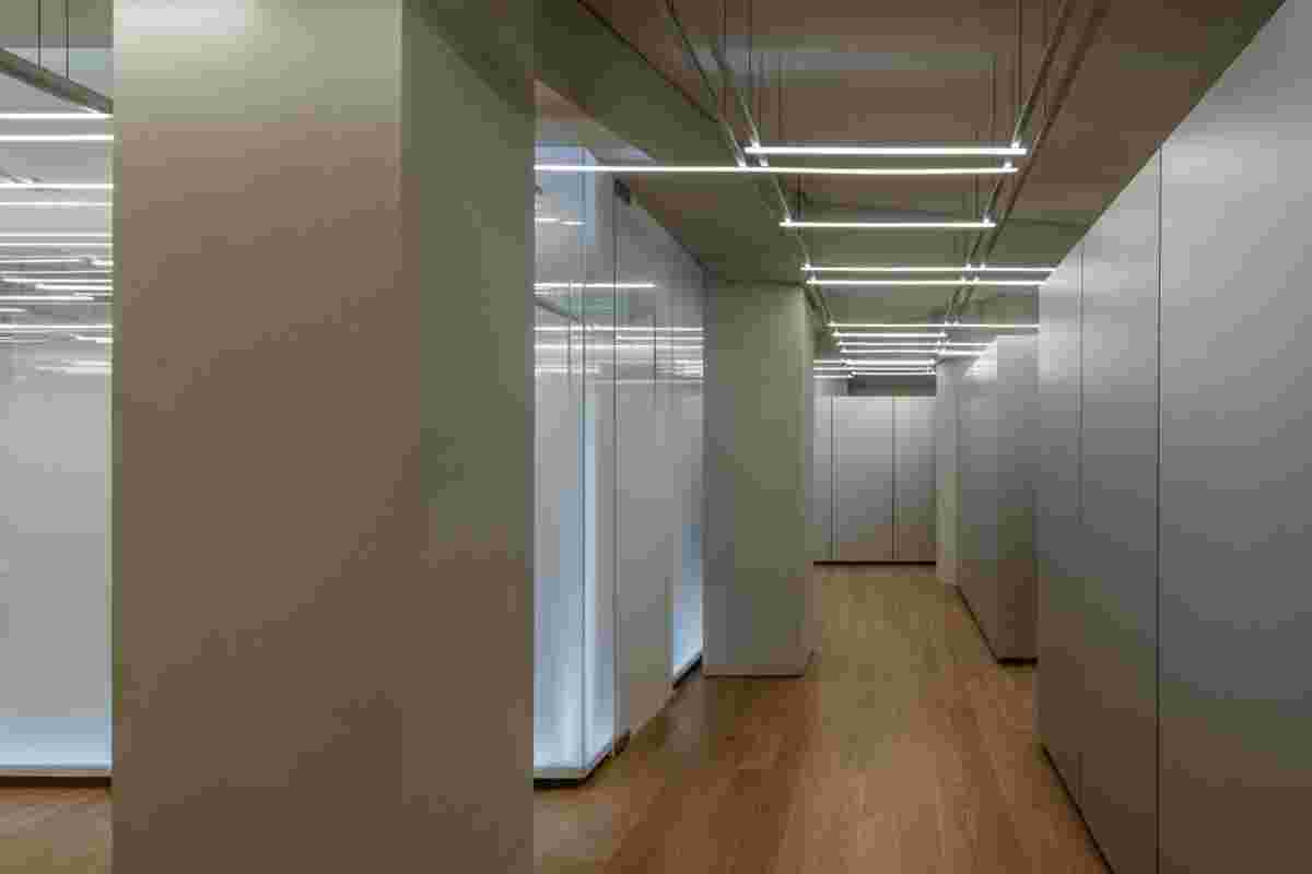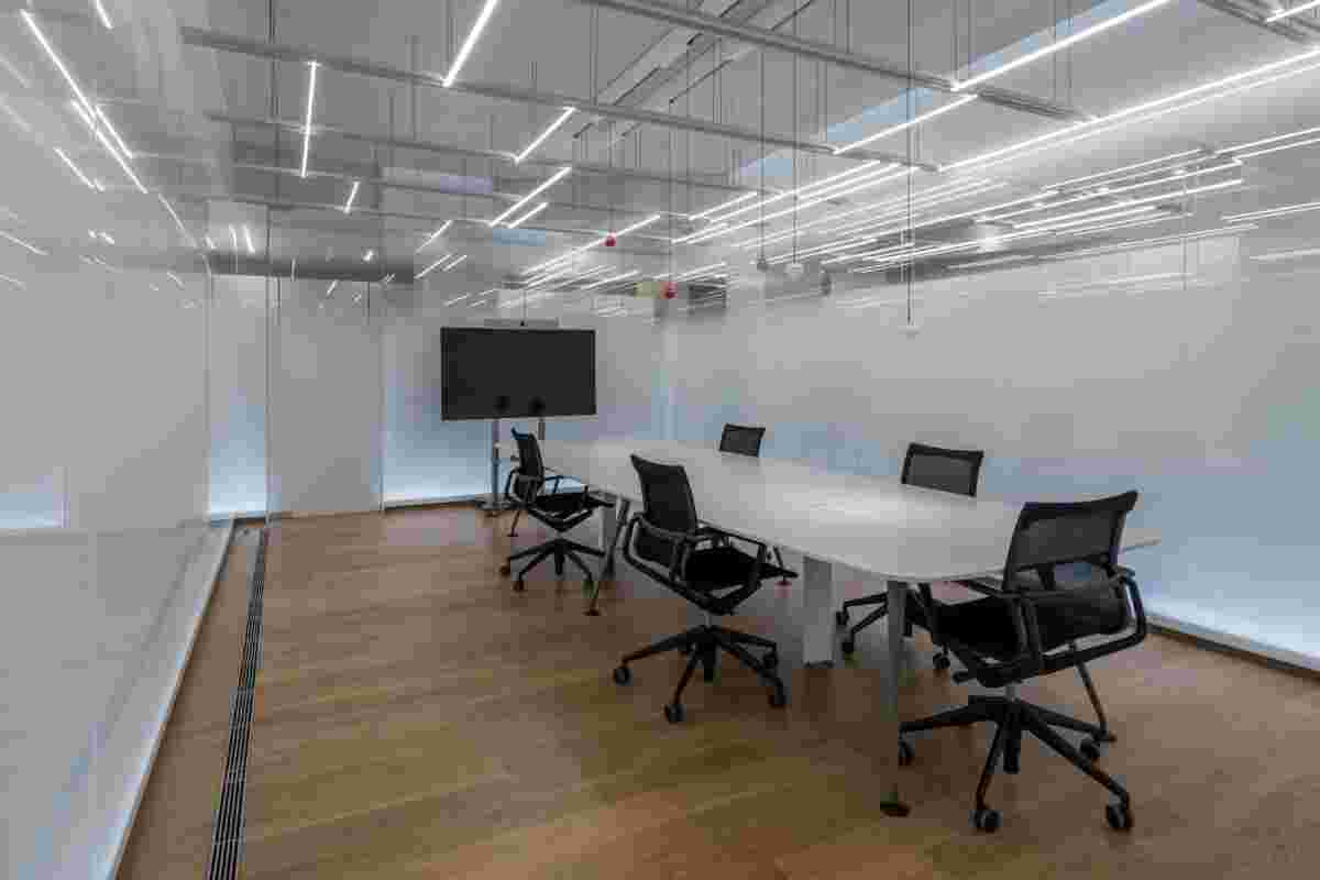 In September 2019, Raycap SA unveiled new meeting room spaces in the basement of their Athens headquarters, where the architectural approach emphasized materiality through a combination of wood floors, neutral tones, minimal metal surfaces, and specially treated glass defining the cubical meeting rooms. The lighting design layered ambient illumination from ceiling-suspended linear LED fixtures, indirect light from the luminous glass walls, and task lighting inside the meeting rooms, creating a comfortable, luminous, and visually engaging environment while addressing technical challenges such as glare control and acoustic integration.